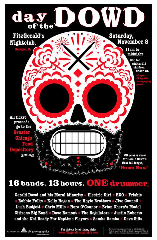 On Nov. 8th, 2014, Gerald Dowd dropped his first full-length album, Home Now. For his record release show, he played drums for 13+ hours with 16 different bands, in the process raising over $10,000 for the Greater Chicago Food Depository.